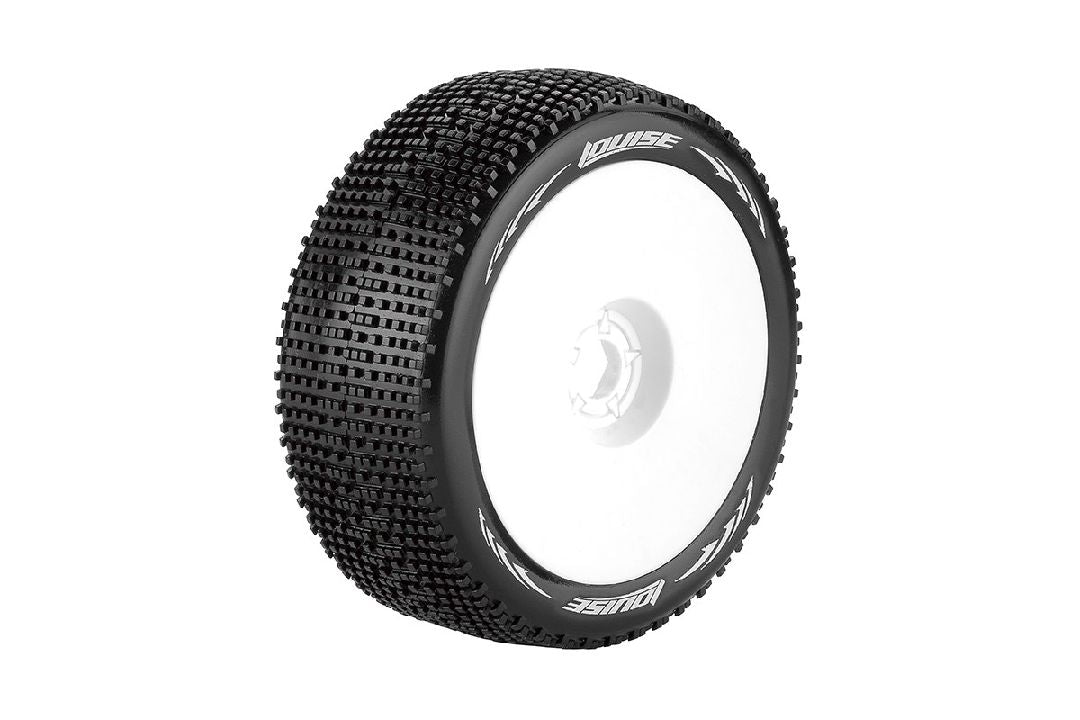 Louise R/C B-Groove 1/8 Buggy (Soft Compound), mounted on white wheels (2).